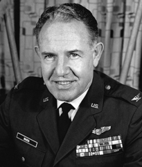 Graduated from Tombstone High School, attended the University of Arizona prior to entering military service on June 24, 1940. Completed navigator training and commissioned Second Lieutenant in June 1941. Subsequent to Tokyo Raid, served two combat tours (80 missions) in B-26s with the 320th Bomb Group in Europe from March 1943 until April 1945. Relieved from active duty in February 1946 and returned to Arizona to pursue opportunities in mining. Recalled in March 1951, served in Europe, Washington, DC; Barksdale, AFB, LA; Kelly AFB, TX. Retired as Chief of Staff, Air Force Security Service in 1973. Last Raider to retire from active duty. Business manager for Catholic Dioceses of San Antonio until 1990. Decorations include the Legion of Merit with 3 Oak Leaf Clusters, Silver Star, Distinguished Flying Cross with 2 Oak Leaf Clusters, Air Medal with 8 Oak Leaf Clusters, Croix de Guerre avec Palme, and Chinese Army, Navy and Air Corps Medal, Class A, 1st Grade.